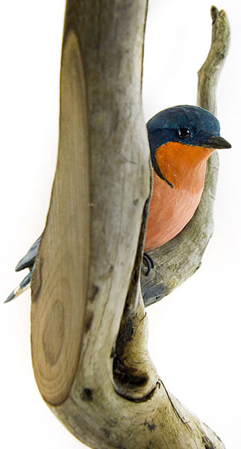 Over the years I have honed my own rustic style of carving and coloring song birds. I whittle Northern White Pine and apply a stain that I make from a blend of mineral spirits and enamel. With these modest materials I create simple bird specimens that, upon close inspection, reveal the beauty of the wood used to craft them. Finally, all of my pieces are mounted with steel legs and feet onto natural pieces of weathered wood that I have collected on my travels.
