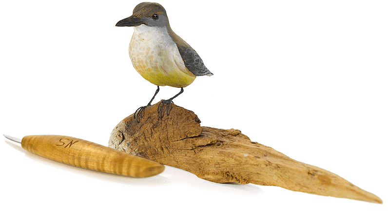 My birds are always carved in Northern White Pine. This native softwood carves easily using only a simple “bench knife”, a basic knife in any collection of carving tools. White pine also compliments my coloring system better than some other woods commonly used by carvers. In the old growth, mixed forests of eastern North America, the northern white pine towers over the other trees, providing food and shelter for many of the same birds that I carve.